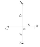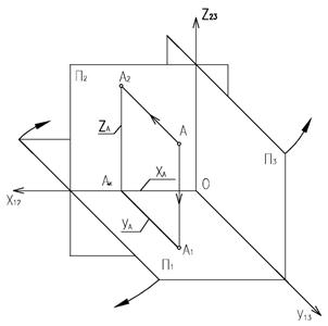 В трехмерном пространстве положение точки определяется тремя (декартовыми) координатами А (xА; yА; zА). Совместив декартовую систему координат с осями проекций, получим начало координат – точку О. Ось ОХ совместим с осью x12, ось ОY – с осью y13, ось ОZ – с осью z23. Горизонтальная плоскость проекции П1 совместится с координатной плоскостью OXY, П2 º XOZ, П3 º YOZ. Тогда точка А и ее проекции определяться координатами: А (xА; yА; zА) Û А1 (xА; yА); А2 (xА; zА); А3 (yА; zА);