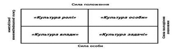 На думку Ч. Хенді, в одній організації в процесі її еволюції можна прослідити всі типи культур. Так, на стадії зародження переважає культура влади, на стадії зростання - культура ролі, на стадії розвитку може формуватися культура завдання або культура особи. На стадії спаду може бути використаний будь-яким з чотирьох типів культур. Модель Ч. Хенді. Американський соціолог Ч. Хенді запропонував свою модель для оцінки корпоративної культури, яка ґрунтується на системі розподілу влади, повноважень і відповідальності. Існують декілька видів сил, що діють в організаціях [171: - сила положення; - сила розпорядження ресурсами; - сила володіння знаннями; - сила особи.