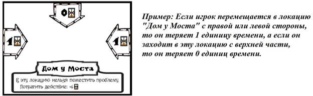А) Действие: Передвижение: В качестве своего действия Тайный сыщик может передвинуться на соседнюю (не по диагонали) локацию, если переход на эту локацию обозначен стрелочкой с числовым значением. При этом он теряет столько единиц времени из своего запаса, сколько требует карточка локации при переходе на неё с той или иной стороны. На локацию с символом «Х» невозможно перейти с указанной стороны. Все карты локаций имеют постоянный эффект, описанный под названием локации.