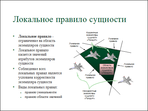 Объявление сущности определяет область экземпляров сущности. По умолчанию в эту область входят все экземпляры сущности, т.е. все возможные наборы значений атрибутов сущности. Иначе говоря, по умолчанию все экземпляры сущности являются корректными. Однако это не всегда соответствует нашим потребностям. Например, для сущности, выражающей самолет, не является корректным наличие в области экземпляров двух самолетов с одинаковыми бортовыми номерами. Точно так же, может потребоваться исключить из этой области все самолеты, имеющие год выпуска, раньше необходимого. Приведенные примеры устанавливают ограничения на область экземпляров сущности, делая некоторые наборы значений атрибутов сущности (т.е. экземпляры сущности) некорректными. Указанные ограничения на область экземпляров сущности определяются с помощью локальных правил сущности. Локальные правила сущности касаются значений атрибутов сущности и определяют те значения или комбинации значений атрибутов сущности, которые требуются для корректности экземпляра сущности. Экземпляр сущности является корректным, когда им соблюдены все локальные правила сущности. В EXPRESS существует два вида локальных правил: правила уникальности и правила области значений.
