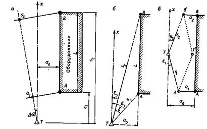 где L — длина базовой линии. Если точки А и В оборудования маркированы, но недоступны для установки реек (линеек), то задача построения параллельной плоскости решается, следующим образом. Выбрав пункт T, из которого видны точки 1 и 2 объекта, устанавливают в нем теодолит и измеряют угол g (рис 43, б), При известных расстояниях до базовых точек (при полной недоступности их получают косвенным способом или определяют конструктивно) удаление ao параллельной плоскости от базовой линии (плоскости) определяют по формуле