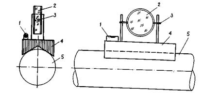 Рис. 48. Схема контроля перпендикулярности вала к оси прокатки автоколлимационным способом Валы небольших диаметров, в частности, рольгангов и прокатных станов можно контролировать автоколлимационным теодолитом, ориентированным вдоль оси прокатки, и автоколлимационным зеркалом 2 на призматической опоре 4 (рис. 48). Такая опора, снабженная Т-образным уровнем 1, хорошо фиксирует плоскость зеркала относительно оси вала 5. Зеркало укреплено в оправе, имеющей вращение вокруг горизонтальной оси 3, параллельной призменной грани опоры. Это позволяет наклонять зеркало в плоскости, нормальной к оси вала, и обеспечивает получение в теодолите автоколлимационного изображения сетки. Для простоты выполнения поверок и контрольных операций в процессе измерений зеркало должно быть двусторонним. Сначала поверяются уровни (перестановкой опоры на 180°), затем условие, чтобы плоскость зеркала была параллельна оси его вращения (юстировку выполняют перемещением оправы на половину дуги отклонения), и, наконец условие, чтобы ось вращения зеркала и ребро призматической опоры находились в одной плоскости (юстировку выполняют путем перемещения оси). В последних двух поверках используют теодолит с зеркалом, причем в первой поверке зеркало вращается на 180°, а во второй — изменяется на 180° положение опоры. В начале работ автоколлимационный теодолит ориентируют по продольной оси оборудования и закрепляют в таком положении. Затем на выверяемый вал устанавливают призменную подставку с зеркалом в месте нуля. При совпадении отраженного от зеркала изображения вертикального штриха сетки нитей с его действительным изображением ось вала перпендикулярна к главной оси оборудования. Если изображения нитей сетки не совпадают, то вал подлежит развороту на некоторый угол j. Здесь обычно рассматривают два случая геодезического обеспечения монтажных работ. Первый случай — выверка состоит в развороте вала на угол j, т.е. до тех пор, пока изображения нитей сетки не совпадут. Второй случай — исполнительная съемка — состоит в определении угла j и сравнении его с допускаемым значением неперпендикулярности. Обычно измерение угла j производят поворотом алидады теодолита микрометренным винтом до совпадения изображений нитей сетки. Если зеркало жестко посажено на призме и, следовательно, не имеет горизонтального круга для поворота по азимуту (такая конструкция встречается реже), то изменение угла j производят только теодолитом. При развороте теодолита угол неперпендикулярности j определяют по формуле j=М—М0, где М — отсчет по горизонтальному кругу при совпадении изображений нитей сетки автоколлимационного теодолита; М0 — место нуля горизонтального круга теодолита, соответствующее положению коллимационной плоскости параллельно оси прокатки. При выверке перпендикулярности торцевой плоскости вала или цилиндрической обечайки к ее оси можно использовать автоколлимационный способ при установке теодолита на продольной оси конструкции и автоколлимационного зеркала на торце. Если размещение зеркала на торце затруднено, например, при большом диаметре обечайки (более 3 м), выверку целесообразно делать косвенным способом, устанавливая теодолит в наклонном положении вне объекта таким образом, чтобы коллимационная плоскость трубы была перпендикулярна к оси обечайки.