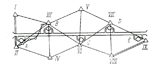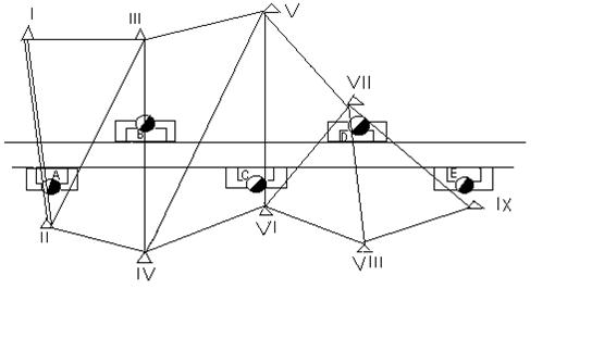 3.8.РАСЧЕТ НЕОБХОДИМОЙ ТОЧНОСТИ ИЗМЕРЕНИЙ 3.8.1.Туннельная триангуляция 1) Туннель сооружается через стволы АВСДЕ. Сгущение триангуляции не предусматривается, т.е. пункты находятся непосредственно у стволов. Рассчитаем какуюможно допустить СКО m2-4=mU (в поперечном направлении к оси тоннеля) определения взаимного расположенияпунктов II-IX, находящихся на концах строящегося тоннеля. m1-средняя квадратическая ошибка тоннельной триангуляции между смежнойпарой стволов. Для всего ряда триангуляции m - m - n-количество сбоек по трассе тоннеляn = L/l - L - длина тоннеля - l - среднее расстояние между стволами тогда m Ошибка m Подставим значение m1 из (2), получим среднийквадратический сдвиг триангуляции при сооружении туннеля через стволы: m 2) при сооружении через порталы: m При сооружениикриволинейных тоннелей поперечные и продольные ошибки необходимо принять одинаковыми: m Через порталы: m При сгущении тоннельной триангуляции ходами основной полигонометрии ошибканаземногообоснования будет слагаться из ошибок триангуляции и полигонометрии, т.е. m1= Принимая принцип равных влияний, получим: mT=m1/ Т.е. полученные выше величины допусков должны быть уменьшены в 1.4 раза. Таблица 1