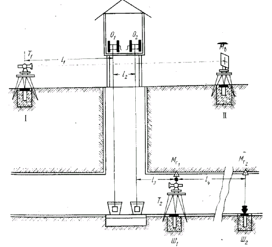 Рис. 2. Ориентирование подземной основы способом створа двух отвесов Под действием собственных колебаний, колебаний точек подвеса, движения воздуха в стволе и падающих капель эти отвесы немного колеблются даже если грузы помещают в сосуды с водой или маслом. Эти колебания у обоих отвесов имеют различные направления и амплитуды, в результате чего совместить визирный луч теодолита точно со створом отвесов невозможно. Поэтому получить m0< 30² не удается. Способ применяется на начальной стадии проходки, при удалении забоя от ствола на расстояние до 70 м. При большем удалении требуются более точные способы ориентирования.