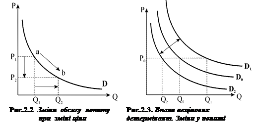Попит – це множина співвідношень цін і відповідних кількостей товару. Попит, як взаємозв’язок ціни і кількості, можна зобразити графічно у вигляді кривої попиту (рис.2.1). Конкретну кількість товару, яку покупці бажають і можуть придбати за кожного рівня ціни, називають обсягом попиту. Його можна визначити за графіком як параметр точки на кривій попиту: наприклад, обсяг попиту на яблука за ціною 4 гривні за кг становить 20 кг на день. Закон попиту твердить, що між ціною і обсягом попиту існує обернений зв’язок: обсяг попиту скорочується зі зростанням ціни і зростає зі зниженням ціни. Математичним виразом закону попиту є функція попиту: QD=f(P), де QD – обсяг попиту на товар, D – попит, P – ціна товару. Лінійна функція попиту описується рівнянням: QD=a–b·P. Ціна є основною детермінантою попиту, зміна якої спричиняє зміни в обсязі попиту, що графічно відповідає руху між точками на даній кривій попиту (рис. 2.2). Нецінові детермінанти попиту спричиняють зміни у попиті, що графічно відповідає зміщенню всієї кривої попиту: праворуч-вгору, якщо попит зростає, і ліворуч-вниз, якщо попит скорочується (рис. 2.3). Нецінові детермінанти являють собою основні мотиви споживчого попиту. До нецінових детермінант попиту відносяться: смаки і уподобання споживачів; доходи споживачів; ціни сполучених товарів; кількість споживачів на ринку; очікування споживачів відносно майбутніх цін.