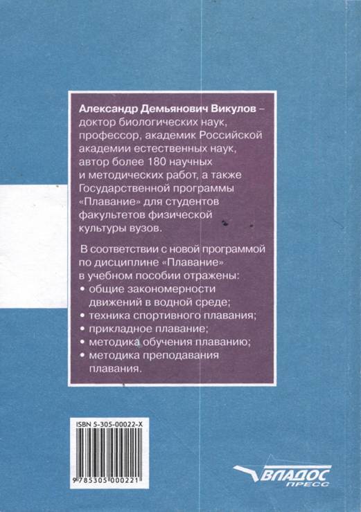 Викулов Александр Демьянович ПЛАВАНИЕ Учебное пособие для студентов высших учебных заведений Редактор В.Н. Савицкая Компьютерная верстка Т.И. Кравцова Корректор Б.Б. Кузнецова Отпечатано с диапозитивов, изготовленных ООО «Издательство ВЛАДОС-ПРЕСС». Лицензия ИД № 00349 от 29.10.99. Санитарно-эпидемиологическое заключение № 77.99.02.953.Д.006153.08.03от 18.08.2003. Сдано в набор 19.05.01. Подписано в печать 15.03.02. Формат 60x88/16. Печать офсетная. Бумага газетная. Усл. печ. л. 22,54. Тираж 10 000 экз. (2-й завод 5 001-10 000 экз.). Заказ № 541. Издательство ВЛАДОС-ПРЕСС. 119571, Москва, просп. Вернадского, 88, Московский педагогический государственный университет. Тел. 437-11-11,437-25-52,437-99-98; тел./факс 735-66-25. E-mail: vlados@dol.ru http://www.vlados.ru Отпечатано в ОАО Ордена Трудового Красного Знамени «Чеховский полиграфический комбинат» 142300, г. Чехов Московской области. Тел. (272) 71-336, факс (272) 62-536.