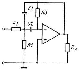 Принципиальная схема ПФ приведена на рисунок 2.66. Он как бы состоит из звеньев ФНЧ и ФВЧ. Полагая Ku ОС=1 на резонансной частоте ω0 и C1 = С2 = С, можно сопротивления определить из следующих выражений: