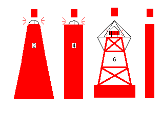 Окраска – красная, обозначение на картах - к Форма – буи сигарообразные, столбовидные или вехи Топовая фигура – красный цилиндр Огонь: цвет – Кр, характер – Пр3с