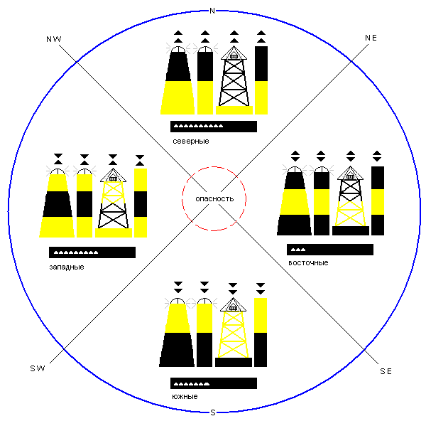 Форма – Буи сигарообразный, столбовидные или вехи Топовая фигура – два черных конуса один над другим. Огонь – Бл Северные буи и вехи –выставляются в северном секторе, к N от опасности: Окраска буя – вверху черный, внизу желтый, обозначение на картах - чж Топовая фигура – конусы вершинами вверх. Характер огня – Ч Восточные буи и вехи –выставляются в восточном секторе, к Е от опасности: Окраска буя – черный с широкой желтой горизонтальной полосой; обозначение на картах - чжч Топовая фигур – конусы основаниями вместе. Характер огня – Ч (3) 10с Южные буи и вехи –выставляются в южном секторе, к S от опасности: Окраска буя – вверху желтый, внизу черный: обозначение на картах – жч Топовая фигура – конусы вершинами вниз. Характер огня – Ч (6) Дл Пр 15с Западные буи и вехи – выставляются и западном секторе, к W от опасности; Окраска буя – желтый с широкой черной горизонтально полосой; обозначение на картах – жчж Топовая фигура – конусы вершинами вместе Характер огня – Ч (9) 15с