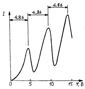 разностью потенциалов, приложенной между катодом и сеткой С1. Между сеткой С2 и анодом приложен небольшой (примерно 0,5 в) задерживающий потенциал; электроны, ускоренные в области 1, попадают в область 2 между сетками, где испытывают соударения с атомами паров ртути; электроны, которые после соударений имеют достаточную энергию для преодоления задерживающего потенциала в области 3, достигают анода. При неупругих соударениях электронов с атомами ртути последние могут возбуждаться. Каждый из атомов ртути может получить лишь вполне определенную энергию, переходя при этом в одно из возбужденных состояний. Поэтому если в атомах действительно существуют стационарные состояния, то электроны, сталкиваясь с атомами ртути, должны терять энергию дискретно, определенными порциями, равными разности энергий соответствующих стационарных состояний атома. Из опыта следует (рис. 35), что при увеличении ускоряющего потенциала вплоть до 4,86В анодный ток возрастает монотонно, его значение проходит через максимум (4,86 В), затем резко уменьшается и возрастает вновь. Дальнейшие максимумы наблюдаются при 2×4,86 и 3×4,86 В. Ближайшим к основному, невозбужденному, состоянию атома ртути является возбужденное состояние, отстоящее от основного по шкале энергии на 4,86 эВ. Пока разность потенциалов между катодом и сеткой меньше 4,86 эВ, электроны, встречая на своем пути атомы ртути, испытывают с ними только упругие соударения. При е×j = 4,86 эВ. энергия электрона становится достаточной, чтобы вызвать неупругий удар, при котором электрон отдает атому ртути всю кинетическую энергию, возбуждая переход из одного из электронов атома из нормального энергетического состояния на возбужденный энергетический уровень. Электроны, потерявшие свою кинетическую энергию, уже не смогут преодолеть тормозящего поля и достигнуть анода. Этим и объясняется первое резкое падение анодного тока при е×j =4,86 эВ. Если значения энергии кратны 4,86 эВ, электроны могут испытать с атомами ртути 2, 3,... неупругих соударения, потеряв при этом полностью свою энергию и не достигнув анода, т.е. должно наблюдаться резкое падение анодного тока. Это действительно наблюдается на опыте (рис. 36).