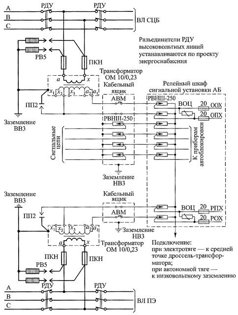 Перегонные сигнальные установки автоблокировки получают питание от двух однофазных масляных трансформаторов типа ОМ-10/0,23 мощностью 0,63; 1,25 и 4 кВ·А, присоединенных к линиям основного питания ВЛ СЦБ и резервного питания ВЛ ПЭ (рис. 3.4).