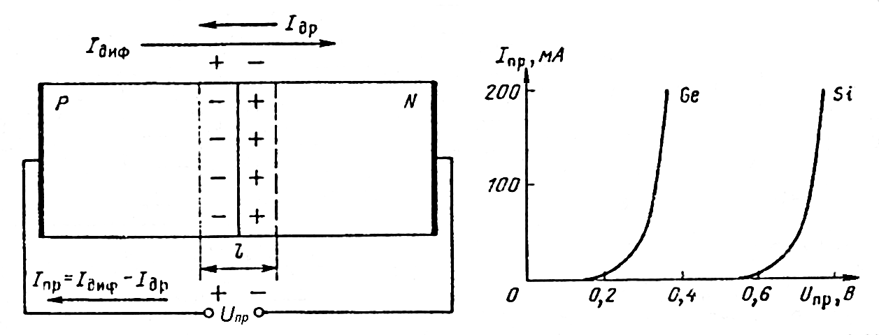 Рисунок 1.9. а – Прямое включение PN -перехода; б – ВАХ PN -перехода для германия и кремния