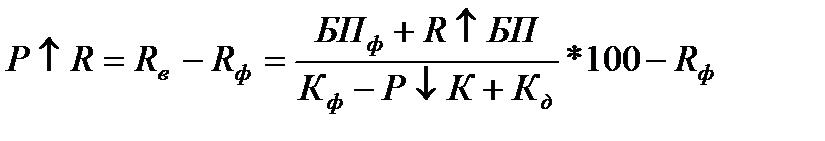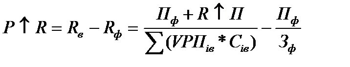 где Р↑R – резерв роста рентабельности; Rв – рентабельность возможная; Rф – рентабельность фактическая; Пф – фактическая сумма прибыли; Р↑П - резерв роста прибыли от реализации продукции; VРПв – возможный объем реализации продукции с учетом выявленных резервов его роста; Сiв – возможный уровень себестоимости i-х видов продукции с учетом выявленных резервов снижения; Зф – фактическая сумма затрат по реализованной продукции. Резерв повышения уровня рентабельности капитала может быть подсчитан по формуле