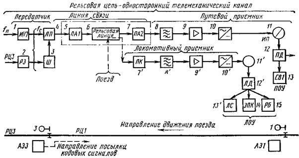 Более сложными являются РЦ, используемые в качестве телемеханического канала связи в кодовых системах АБ и непрерывных системах АЛС. Общую структурную схему РЦ для числовой кодовой АБ (рис. 14) образуют следующие звенья: источник И или генератор Г, получающий питание от сети переменного тока частотой f п и вырабатывающий сигнальный ток частотой f c; решающее звено РЗ, управляющее шифратором сообщений (роль РЗ выполняет дешифратор, отражающий состояние впереди лежащей рельсовой цепи РЦЗ); шифратор Ш, модулирующий переменный ток частотой f c в соответствии с передаваемыми кодовыми сигналами; линейный передатчик ЛП; линия связи – промежуточная и защитная аппаратура ПА1 и ПА2 и рельсовая линия; путевой приемник – фильтр, усилитель, выпрямитель и импульсное путевое реле ИП; путевой дешифратор ПД, связанный с выходом путевого приемника и управляющий светофором СВ1, путевой объект управления ПОУ – напольный светофор СВ1. Путевой приемник, соединенный с рельсовой линией кондуктивно или индуктивно, при свободности линии получает кодовые сигналы и через дешифратор управляет светофором. Если линия свободна от подвижного состава и исправна, то кодовые сигналы поступают к путевому приемнику и на светофоре, ограждающем данную РЦ, появляется разрешающее показание; если же линия занята подвижным составом или повреждена, то кодовые сигналы не могут вызвать срабатывание приемника и на светофоре загорается красный огонь Выбор кодового сигнала или позиция шифратора Ш определяется состоянием впереди лежащего блок-участка (по ходу поезда). В непрерывных системах АЛС связь локомотивного приемника с рельсовой линией устанавливается лишь после вступления локомотива на ее входной конец. При этом образуется односторонний телемеханический канал, в состав которого входят узлы 1-6 РЦ. Роль узла 7 выполняют приемные локомотивные катушки ПК (7'), размещенные на локомотиве перед первой колесной парой над рельсами. Между РЛ и этими катушками устанавливается индуктивная связь посредством магнитного поля, образованного вокруг рельсов переменным сигнальным током, протекающим по рельсам. Участок рельсов под катушками, воздушный промежуток и приемные катушки образуют индуктивную линию, входящую в состав индуктивно-рельсовой линии ИРЛ, являющейся линией связи телемеханического канала АЛС. Структурная схема большинства других видов РЦ может быть получена из схемы рис. 14 путем исключения или небольшой корректировки некоторых ее узлов.
