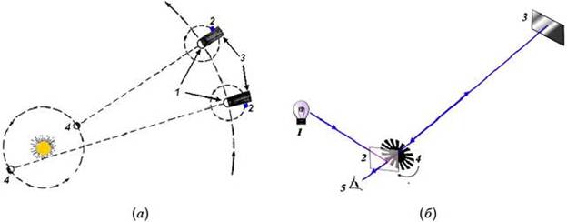 Свет – это электромагнитные волны с длиной волны в диапазоне между 380 и 760 нм, воспринимаемые человеческим глазом. Раздел физики, изучающий свойства света и его взаимодействие с веществом, называют оптикой. Впервые скорость света измерил датский астроном О. Рёмер в 1676 году. Регистрируя моменты времени, когда спутник Юпитера Ио выходит из тени Юпитера, Рёмер и его предшественники заметили отклонения от периодичности. При отдалении Земли от Юпитера моменты выхода Ио из тени Юпитера задерживались, по сравнению с предсказанными, и максимальная задержка составляла 1320 с, которая была необходима для распространения света через орбиту Земли (рис. 17а). Во времена Рёмера диаметр орбиты Земли считался равным примерно 292 000 000 км. Разделив это расстояние на 1320 секунд, Рёмер получил, что скорость света равна 222 000 км/с. Теперь известно, что максимальное запаздывание затмений Ио равно 996 с, а диаметр орбиты Земли составляет 300 000 000 км. Если внести эти поправки то, получается, что скорость света равна 300 000 км/с. Скорость света в лабораторных условиях (без астрономических наблюдений) впервые была измерена французским физиком А.И.Л. Физо в 1849 году с помощью установки, изображённой на рис. 17б. В этой установке луч света от источника 1 падал на полупроницаемое зеркало 2 и отражался от него в сторону другого зеркала 3, находящегося на расстоянии 8,66 км. Луч, отражённый от зеркала 3, снова падал на полупроницаемое зеркало 2, проходил через него и попадал в глаз наблюдателя, 5. Между зеркалами 2 и 3 размещалось зубчатое колесо, 4, которое можно было вращать с заданной скоростью. При этом зубцы вращающегося колеса разбивали луч света на последовательность коротких вспышек – импульсов света. В опытах Физо колесо вращали со всё возрастающей скоростью, и наступал такой момент, когда световой импульс, пройдя через промежуток между его зубцами и отразившись от зеркала 3, задерживался переместившимся за это время зубцом. В этом случае наблюдатель ничего не видел. При дальнейшем ускорении вращения зубчатого колеса свет снова появлялся, становился все ярче и, наконец, достигал максимальной интенсивности. На зубчатом колесе в опытах Физо, было 720 зубцов, а максимальной интенсивности свет достигал при 25 оборотах в секунду. На основании этих данных Физо вычислил скорость света, которая оказалась равной 312000 км/с. Современные исследования показали, что скорость света в вакууме — фундаментальная физическая постоянная, равная 299 792 458 м/с. Скорость света обозначается буквой c – первой буквой латинского слова celeritas, означающего «быстрота». Как показали опыты, скорость света в вакууме не зависит ни от скорости движения источника света, ни от скорости движения наблюдателя. Поэтому за эталон метра принято расстояние, которое проходит свет в вакууме за промежуток времени, равный 1/299792458 секунды. Знание точной величины скорости света имеет большое практическое значение, например, для определения расстояний с помощью радиолокации в геодезии и в системах слежения за искусственными спутниками Земли и межпланетными космическими станциями. Скорость света была измерена в различных прозрачных средах (воздухе, воде и др.), и оказалась, что во всех веществах она меньше, чем в вакууме. В природе со скоростью света распространяются не только собственно видимый свет, но и другие виды электром