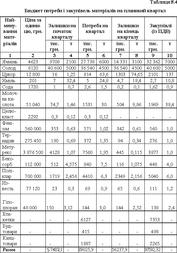 Бюджет виробництва тісно зв'язаний з бюджетом виробничих запасів (планом закупівель матеріальних ресурсів). Тому їх рекомендують складати паралельно. Це дуже важливий момент, тому що від планованого рівня запасів буде залежати й обсяг їхнього фінансування. На відміну від бюджету виробництва, який розробляють у фізичному вимірнику, бюджет запасів формують у вартісному вираженні. При підготовці даного бюджету доцільно приділити велику увагу обсягу запасів сировини і матеріалів на кінець планованого періоду. Бюджет запасів містить інформацію, необхідну для підготовки двох фінансових документів: бюджету руху грошових коштів і прогнозу балансу активів і пасивів. За планування запасів на підприємстві відповідають відділи постачання, фінансовий, бухгалтерія й ін. На основі виробничої програми, нормативів витрат на матеріали й інформації про їхні залишки на складі складають бюджет потреби в них і закупівель матеріальних ресурсів. Даний бюджет представлений у табл. 8.4.