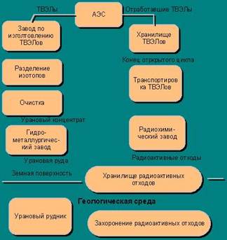 Завершающий этап ЯТЦ предполагает обращение с отработавшим топливом, с учетом его высокого энергетического потенциала, а также рисков для безопасности, которые представляет ОЯТ и содержащиеся в нем долгоживущие радионуклиды. Обращение с ОЯТ – термин, объединяющий все виды деятельности, которые связаны с обработкой, кондиционированием, транспортировкой, хранением, переработкой и захоронением топливных элементов, облученных в реакторе. Завершающая стадия топливного цикла атомной энергетики включает в себя: 1) выгрузку из реакторов выгоревшего (отработавшего) топлива; 2) длительную выдержку на АЭС в специальных охлаждающих бассейнах зала отработавших ТВС; 3) транспортировка после выдержки в бассейнах АЭС отработавших ТВС на перерабатывающий радиохимический завод (РХЗ): размещение ТВС в бассейнах склада хранилища; 4) химическую переработку (регенерацию) отработавшего топлива на РХЗ; 5) превращение извлеченного при химической переработке твэлов урана и плутония в форму, пригодную для изготовления топлива и возврата в топливный цикл; 6) концентрирование и промежуточное хранение высоко-, средне- и низкоактивных отходов, полученных при переработке отработавшего топлива; 7) окончательное удаление (захоронение) радиоактивных отходов. Наиболее сложными операциями являются: химическая переработка, извлечение и очистка урана и плутония, а также наиболее полное извлечение и концентрирования радиоактивных веществ.