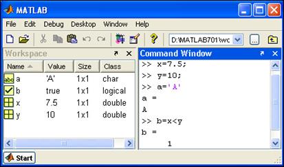 В СКМ Matlab можно создавать переменные, принимающие значения типа double – число, char – символ и logical – истина или ложь. Любые значения интерпретируются в Matlab как матрицы. Матрицы размером 1×1 используются как скаляры (без указания индексов). Все созданные в командном окне Command Window переменные размещаются в рабочей области Workspace (рис. 1.5) с указанием имени, текущего значения, размера, типа (класса). Числа задаются в формате с фиксированной и плавающей десятичной точкой. Разрешено использование комплексных чисел. Символы задаются в апострофах. Для логических данных 0 обозначает ложь (false), 1 – истину (true). Любое ненулевое число интерпретируется как истина.
