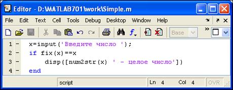 Рис. 3.3. Окно редактора с текстом скрипта Скрипт сохранен в файле Simple.m на диске D в каталоге MATLAB701 в папке work. При запуске скритпа на выполнение на экран в рабочем окне Matlab будет выдано приглашение Введите число Если ввести 7, то результатом работы программы будет 7 - целое число Если же ввести 7.2, то на экран ничего не выведется. Во-вторых, можно использовать более развернутый вариант развилки if услови е операторы1 else.. оператры2 end В этой форме имеется дополнительное ветвление внутри тела оператора if (рис. 3.2, б). Оператор else не содержит условия. Последовательность инструкций операторы2, связанная с ним, выполняются, если выражение условие оператора if ложно. На основе такой формы оператора if предыдущая задача решается более красиво. x=input('Введите число '); if fix(x)==x disp([num2str(x) ' - целое число']) else disp([num2str(x) ' - не целое число']) end В-третьих, самая общая конструкция развилки if условие1 операторы1 elseif условие2 операторы2 else операторы3 end в которой оператор elseif содержит условие2, которое вычисляется, если предшествующее условие1 оператора if ложно. Здесь один оператор if встроен (вложен) в else ветку другого оператора if (рис. 3.2, в). Инструкции операторы2, связанные с оператором elseif, выполняются, если условие2 истинно, иначе выполняются операторы3 else ветки. В следующем фрагменте программы проверяется, является ли символ, введенный с клавиатуры, прописной или строчной латинской буквой: sym=input('Введите символ ','s'); if sym>='A' & sym<='Z' disp([sym ' - прописная латинская буква']) elseif sym>='a' & sym<='z' disp([sym ' - строчная латинская буква']) else disp([sym ' - не латинская буква']) end Примечание: поскольку sym – символьная переменная, то в disp нет необходимости в преобразовании типа конкатенируемых значений. Оператор elseif может многократно использоваться внутри оператора условия if. Возможен вариант вложенного оператора if без последней ветки else if условие1 операторы1 elseif условие2 операторы2 end Какая бы из форм развилки не применялась, в любом случае область действия условного оператора начинается ключевым словом if, а заканчивается ключевым словом end. Под условием понимается произвольное выражение, истинность или ложность которого понимается как отличие от нуля или равенство нулю соответственно. Чаще всего для построения выражения условие используют операции сравнения и логические операции. Следует отметить особенности построения развилок, связанные с тотальным использованием массивов в языке программирования системы Matlab. Массивы можно использовать в выражениях, входящих в условие. В этом случае, истинность условия наступает, когда истинны (не равны нулю) все элементы массива. Если хоть один элемент такого массива будет равен нулю, то условие считается ложным. Ложность будет иметь место и при использовании пустых массивов. Приведём простейший пример, иллюстрирующий работу условного оператора с условием-массивом. a = [ 1 2; 4 0 ]; if a b = 1; else b = 2; В результате выполнения этого фрагмента переменная b получит значение, равное 2, так как матрица a содержит один нулевой элемент, и всё условие считается ложным. Запись if a по своему действию полностью эквивалентна записи if a~=0 или записи if all(a(:)).