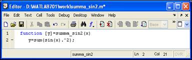 Примечания: 1. Обратите внимание, в конце второй строки функции (рис. 5.1) стоит точка с запятой. Как и для скрипта, это – подавление эхо-печати. Отсутствие символа ";" приведет к тому, что при каждом вызове функции summa_sin2 в командном окне будет выполняться печать значений элементов вектора y. Во избежание вывода на экран нежелательных промежуточных результатов необходимо в тексте функции все вычислительные операторы завершать символом ";". 2. Для вычисления квадрата используется операция поэлементного (.^) возведения в квадрат: sin(x) – вектор, т.к. вектором является аргумент х. Использование не поэлементного, а матричного возведения в квадрат вызовет ошибку ??? Error using ==> mpower Matrix must be square. Error in ==> summa_sin2 at 2 sin(x)^2 Что означает "Ошибочное использование матричного произведения. Матрица должна быть квадратной. Ошибка в summa_sin2 во второй строке, а именно при вычислении sin(x)^2".