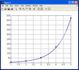 Подставим в систему соответствующие значения х и у из таблицы. Запишем m-функцию function system=sysur(coef) global y x system=[coef(1)*coef(2)^x(1)+coef(3)-y(1); coef(1)*coef(2)^x(3)+coef(3)-y(3); coef(1)*coef(2)^x(5)+coef(3)-y(5)]; и файл-сценарий global y x; x=1:5; y=[6.5 20 53.5 167 473]; x0=[1; 1; 1;]; coef=fsolve(@sysur,x0) В результате выполнения скрипта с m-функцией получим следующий вектор коэффициентов моделирующей функции coef = 1.9850 2.9876 0.5698 Следовательно, интерполяционная функция будет иметь вид у м=1,9850·2,9876 х +0,5698. Моделирующая кривая у м(х) в обязательном порядке пройдет через первую, третью и пятую точки таблицы, по которым были определены ее параметры, но необязательно через вторую и четвертую (рис. 5.6). Примечание: по правилам использования стандартной функции fsolve m-функция, описывающая решаемую систему уравнений, должна иметь один формальный параметр – искомые коэффициенты. Для пересылки в файл-функцию sysur значений векторов х и у в головной программе и в функции объявляются глобальные данные (после слова global указывается перечень глобальных переменных через пробел).