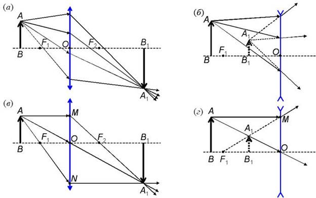 Рис. 22. (а) – ход лучей, исходящих из точки А и падающих на собирающую линзу с оптическим центром О и главными фокусами в точках F1 и F2; (б) – то же для рассеивающей линзы; (в) и (г) – к построению изображения предмета АВ в собирающей и рассеивающей линзах соответственно.