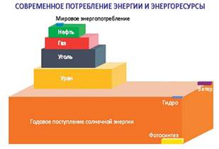 По теоретическим расчетам современные мировые потребности в энергии можно было бы обеспечить за счет солнечной энергии, получаемой ежегодно земной поверхностью площадью 22 тыс. км2 при КПД = 1. Если учесть, что средний КПД современных фотоэлементов 10‑25 %, то для электростанции мощностью 1 ГВт площадь фотоэлементов составит около 10-40 км2. В настоящее время ФЭС генерируют около 1 % мировой электроэнергии. Другими направлениями альтернативной энергетики являются ветроэнергетика (2,5 % мирового производства электроэнергии), геотермальная энергетика (0,3 %). По прогнозам к 2040 г. доля альтернативных возобновляемых источников энергии (вместе с гидроэнергетикой) должна увеличиться до 25 % в мировом энергобалансе.