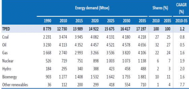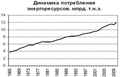 Из-за влияния различных факторов развития мировой экономики темпы роста потребления топливно-энергетических ресурсов будут существенно снижены и предположительно составят в мировом масштабе 1,7 % в год. Энергопотребление в странах ОЭСР в 2030 г. будет всего на 6 % выше, чем сегодня, и в среднем рост будет составлять 0,3 % в год до 2030 г. После 2020 г. потребление энергии на душу населения в странах ОЭСР начнет снижаться (-,2 % в год). Потребление энергии в странах за пределами этой организации, по прогнозам, увеличится почти в два раза (или на 68 %), показывая средний рост в 2,6 %, и на эти страны будет приходиться 93 % мирового роста энергопотребления. Голод на энергоносители в основном одолевает Китай, Индию и остальные быстроразвивающиеся страны. Мировое потребление ископаемых топлив составляет 12 млрд т.н.э. (по данным British Petroleum ВР, 2003 г.), причем в Европейском союзе 2,0 млрд т.н.э., в США 3,4 млрд т.н.э., в России 1,3 млрд т.н.э. К 2030 г. по прогнозу ВР мировое потребление ископаемых топлив составит 20 млрд т.н.э. Возобновляемые источники энергии и ядерная энергетика будут наиболее быстро растущими. Тем не менее, топливный баланс будет меняться относительно медленно из-за длительного жизненного цикла активов. В целом доля энергии, произведенной из ископаемого топлива, к 2030 г. снизится лишь до 65‑75 % (с 87 %). Возобновляемые источники энергии вырастут с 1,8 % до 15 %, и ядерные увеличатся с 5 % до 7 %.