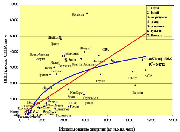 Из рис. видно, что за последние 30 лет потребление на душу населения во всех странах существенно возросло, и одновременно произошла резкая дифференциация стран по эффективности использования энергии в т.у.т. на производство единицы ВВП. В настоящее время существует не одна, а три линии регрессии зависимости ВВП на душу населения от душевого потребления энергии. Первая линия регрессии описывает эффективность потребления энергии в развитых странах, в число которых входят Испания, Израиль, Италия, Великобритания, Швеция, Швейцария, Нидерланды. Вторая линия регрессии в точности совпадает с линией регрессии, которая имела место в 1968 г., на ней располагаются Аргентина, Греция, Южная Корея, Австралия, Норвегия и другие. Особняком среди этих стран стоят США и Канада. США располагается между первой и второй линиями регрессии, а Канада по эффективности энергопотребления существенно отстает от стран второй группы. Третья линия регрессии описывает эффективность потребления энергии в развивающихся, «сырьевых» странах. В их число входят Венесуэла, Индонезия, Иран, Ирак, Мексика, Пакистан, Филиппины. Для этой группе стран характерно крайне неэффективное использование энергии, при которой рост энергопотребления на душу населения практически не ведет к росту ВВП, назовем эти страны группа IV. Заметим, что в группах II и III многие страны (Канада, Норвегия, США, Великобритания) являются крупными производителями топливно-энергетических и других ресурсов, но наряду с сырьевыми отраслями в них исключительно высоко развиты и другие отрасли промышленности. В четвертую входят страны, основу экономики которых составляет продукция топливно-энергетического комплекса. Из анализа рис. 2 следует интересный факт: существует еще одна группа стран, в число которых входят Швейцария, Дания, Япония, Австрия, ФРГ и Франция. Эти страны отличает исключительно высокая эффективность использования энергии для производства ВВП. Важно отметить, что эти страны не располагают собственными сколько-нибудь значительными ресурсами нефти и газа. Назовем эти страны группа I. Как изменилась энергоемкость ВВП в настоящее время? Безусловным лидером по эффективности использования энергии на сегодняшний день является Норвегия, не только сократившая примерно в два раза энергоемкость своей экономики, но и обеспечившая при этом более чем двукратный рост ВВП на душу населения. Это факт тем более назидателен, что Норвегия является нефтедобывающей страной. Снижение энергоемкости изменяет прежние пропорции между ростом национального продукта и энергопотреблением: при меньших удельных затратах энергии и живого труда будет обеспечиваться получение больших материальных ценностей и благ. В этих условиях непрерывный ежегодный рост потребления энергоресурсов постепенно может стабилизироваться, а в отдельных странах и регионах даже снизиться по сравнению с достигнутым уровнем.