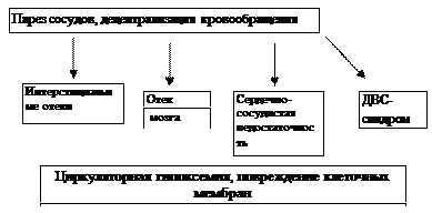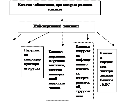 Рис. 1.12. Схема патогенеза инфекционного токсикоза Классификация. Выделяют три степени тяжести токсикоза (табл. 1.29). Табл.1.29. Степени тяжести токсикоза