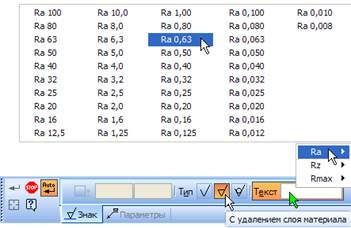 · Нажмите кнопку Шероховатость · Укажите нижний горизонтальный отрезок главного вида — базовый объект для нанесения обозначения шероховатости. · Включите кнопку С удалением слоя материала · Для ввода значения шероховатости щелкните правой кнопкой мыши в поле Текст на Панели свойств. · Из появившегося меню выберите критерий и значение шероховатости.