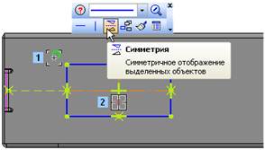 ü Нажмите кнопку ПРЕРВАТЬ КОМАНДУ Плоская параметрическая симметрия: Вторую окружность нужно построить как симметричное изображение первой относительно вертикальной осевой линии прямоугольника. · Выделите окружность (курсор 1) и нажмите кнопку СИММЕТРИЯ · Нажмите кнопку ВЫБОР БАЗОВОГО ОБЪЕКТА · Укажите вертикальную осевую линию прямоугольника (курсор 2).