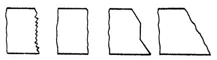 Различают следующие виды разрушения - вязкое, хрупкое и уста-лостное. Вязкое (пластическое) разрушение сопровождается значительной пластической деформацией металла, протекающей по всему объему тела или в его значительной части, и является результатом исчерпания способ-ности материала оказывать сопротивление пластической деформации. Оно присуще пластическим материалам. При пластическом разрушении ско-рость распространения трещины мала и составляет не более 0,05 скорости звука. Цвет излома - матовый. Хрупкое разрушение оставляет лишь следы пластической деформа-ции. Излом – кристаллический, с характерными блестящими гранями от-дельных плоскостей разрушения. При хрупком разрушении скорость рас-пространения трещины составляет 0,2...0,5 скорости звука. Полухрупкое (квазихрупкое) разрушение имеет участки с вязким и хрупким видом из-лома. Оно происходит в наиболее ослабленном сечении (перед краем тре-щины) при напряжении выше предела текучести sт, но меньше предела прочности sВ. Усталостное разрушение происходит при довольно малых пласти-ческих деформациях за счет медленного распространения трещины уста-лости при циклической нагрузке путем накопления в материале необрати- мого повреждения. При этом трещины в материале начинают развиваться задолго до полного разрушения, независимо от того, пластическое это бу-дет разрушение или хрупкое. В зоне усталостной трещины излом имеет матовую поверхность. Продолжительность процесса разрушения занимает больше 90% времени "жизни" детали. Форма поверхности разрушения листового металла при статической или ударной нагрузке приведена на рис.1.2.