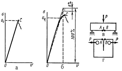 В точке нестабильности скорость высвобождения упругой энергии G (которую также называют движущей силой распространения трещины) достигает критической величины и определяется как Gс, после чего про-исходит разрушение (распространение трещины при неизменном напря-жении). Не следует смешивать начало движения трещины, которое связано с разрушением частиц металла по мере роста нагрузки и зоны пластических деформаций у конца трещины, с началом движения трещины по энергети-ческому условию, если напряжения в образце достигают максимально воз-можного для конкретного образца значения. При испытании нагружением силой Р образцов крупных размеров (рис.4.11) их разрушение наступает внезапно на линейном участке диаг-раммы (рис.4.11, а) и определение К1с и G1с соответствует моменту мак-симальных средних напряжений σс. Перемещение V регистрируют напро-тив надреза с трещиной на базе АВ (рис.4.11, в, г). Если при определении К1с и G1с используют образцы меньших размеров, то условие плоской де-формации целиком не выдерживается и диаграмма перестает быть линей-ной (рис. 4.11, б). Поэтому применяют условную процедуру обработки ре-зультатов испытаний, проводя линию ON на 5% ниже линии упругого участка и для определения К1с и G1с берется напряжение σQ. Величины К1с и G1с носят название критериев Д.Ирвина. В качестве характеристики сопротивляемости металла началу движе-ния трещины используется также и деформационный критерий – критичес-кое раскрытие трещины dс, которое отвечает раскрытию трещины в мо-мент начала ее движения.