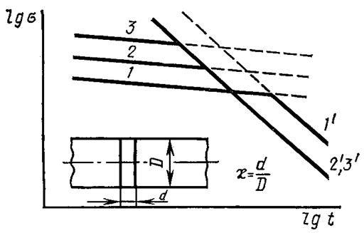 1 – длительная прочность мягкой прослойки при пластической деформации в вязком (1) и хрупком (1/) состояниях; 2, 3– прочность мягкой прослойки в хрупком состоянии при контактном упрочнении ( 2/, 3/ -прочность мягкой прослойки в хрупком состоянии; D – диаметр образца Рисунок 8.8 – Схема изменения длительной прочности металла мягкой прослойки шириной d