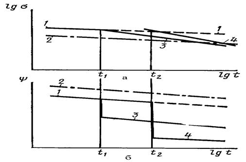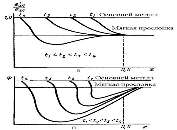 Рисунок 8.9 – Схема изменения длительной прочности (а) и пластичности (б) сварного соединения с мягкой прослойкой В случае более тонкой прослойки (4) разрушение её происходит позднее (t = t2), но наклон прямой 4 оказывается круче, а уменьшение пластичности значительнее из-за более сильного эффекта объемного охрупчивания. При большей длительности уровни прочности соединения с прослойкой могут стать даже ниже уровня прочности самого металла мягкой прослойки (2). Степень проявления эффекта контактного упрочнения зависит от различия свойств основного металла и мягкой прослойки, а также от отно- сительной толщины прослойки. В зависимости от относительной толщины мягкой прослойки Для широкой прослойки ( точно и прочность сварного соединения отвечает прочности мягкой про- слойки. В случае непродолжительного времени до разрушения (кривая t1) прочность сварного соединения оказывается равной прочности основного металла и при сравнительно широких прослойках ( Из рис. 8.10 видно, что уменьшение длительной прочности сопро-вождается снижением пластичности и служит надежным признаком пе-рехода сварного соединения к хрупкому разрушению.