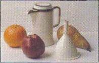 В данном натюрморте, где использован высокий горизонт, построение перспектиоы требует минимальных усилий, исключение составляют изображения чайника и, в меньшей сте пени, корзины, плетенной из ивовых прутьев. После построения перспективы на каждый участок нужно наложить тон; сначала иайти соотношения больших плоскостей света и тени, затем нюансы полутонов на свету и втеки.