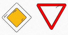 Другой вариант — проехать перекресток прямо, повернуть налево в правом ряду пересекаемой дороги и на зеленый свет вновь проехать перекресток прямо. На Т-образном перекрестке можно повернуть налево, не создавая помех другим транспортным средствам. 10Знаки приоритета На перекрестках действуют обычные правила приоритета, определяемые светофорами и знаками приоритета: · «Главная дорога» · «Уступите дорогу»