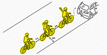 14Движение в группе Двигаясь в группе, соблюдайте интервал не менее 1 метра друг от друга и держитесь не ближе 1 метра от бордюра. Первый в группе велосипедист должен подавать остальным сигналы о маневрах, а также ямах, трещинах и других препятствиях.