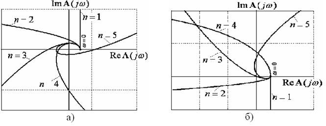 Рис.69. Годографы Михайлова: а) устойчивых систем, б) неустойчивых систем