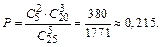 Пример 1. Собрание, на котором присутствуют 25 человек, в том числе 5 женщин, выбирают делегацию из 5 человек. Считая, что каждый из присутствующих с одинаковой вероятностью может быть избран, найти вероятность того, что в делегацию войдут 2 женщины и 3 мужчины. Решение. Число всех способов выбора 5 человек из 25 равно