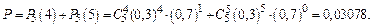 Пример 2. Слово Решение. Вероятность появления буквы Пример 3. Случайно встреченное лицо с вероятностью 0,2 может оказаться брюнетом, с вероятностью 0,3 – блондином, с вероятностью 0,4 – шатеном и с вероятностью 0,1 – рыжим. Каковая вероятность того, что среди пяти случайно встреченных лиц: а) не менее четырех блондинов; б) два блондина и три шатена; в) хотя бы один рыжий? Решение. а) Искомая вероятность составляет (см. формулу (1))