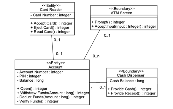 Рис. 9. Пример диаграммы классов Стереотипы классов Стереотипы классов – это механизм, позволяющий разделять классы на категории. В языке UML определены три основных стереотипа классов: · Boundary (граница); · Entity (сущность); · Control (управление). Граничные классы Граничными классами (boundary classes) называются такие классы, которые расположены на границе системы и всей окружающей среды. Это экранные формы, отчеты, интерфейсы с аппаратурой (такой как принтеры или сканеры) и интерфейсы с другими системами. Чтобы найти граничные классы, надо исследовать диаграммы вариантов использования. Каждому взаимодействию между действующим лицом и вариантом использования должен соответствовать, по крайней мере, один граничный класс. Именно такой класс позволяет действующему лицу взаимодействовать с системой. Классы-сущности Классы-сущности (entity classes) содержат хранимую информацию. Они имеют наибольшее значение для пользователя, и потому в их названиях часто используют термины из предметной области. Обычно для каждого класса-сущности создают таблицу в базе данных. Управляющие классы Управляющие классы (control classes) отвечают за координацию действий других классов. Обычно у каждого варианта использования имеется один управляющий класс, контролирующий последовательность событий этого варианта использования. Управляющий класс отвечает за координацию, но сам не несет в себе никакой функциональности, так как остальные классы не посылают ему большого количества сообщений. Вместо этого он сам посылает множество сообщений. Управляющий класс просто делегирует ответственность другим классам, по этой причине его часто называют классом-менеджером. В системе могут быть и другие управляющие классы, общие для нескольких вариантов использования. Например, может быть класс SecurityManager (менеджер безопасности), отвечающий за контроль событий, связанных с безопасностью. Класс TransactionManager (менеджер транзакций) занимается координацией сообщений, относящихся к транзакциям с базой данных. Могут быть и другие менеджеры для работы с другими элементами функционирования системы, такими как разделение ресурсов, распределенная обработка данных или обработка ошибок. Помимо упомянутых выше стереотипов можно создавать и свои собственные.