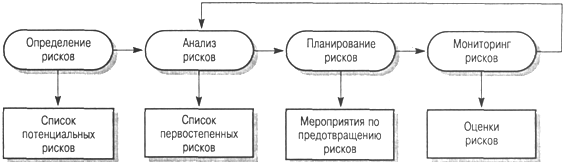 Схема процесса управления рисками показана на рис. 6. Этот процесс состоит из четырех стадий. 1. Определение рисков. Определяются возможные риски для проекта, для разрабатываемого продукта и бизнес-риски. 2. Анализ рисков. Оценивается вероятность и последовательность появления рисковых ситуаций. 3. Планирование рисков. Планируются мероприятия по предотвращению рисков или минимизации их воздействия на проект. 4. Мониторинг рисков. Постоянное оценивание вероятностей рисков и выполнение мероприятий по смягчению последствий проявления рисковых ситуаций.