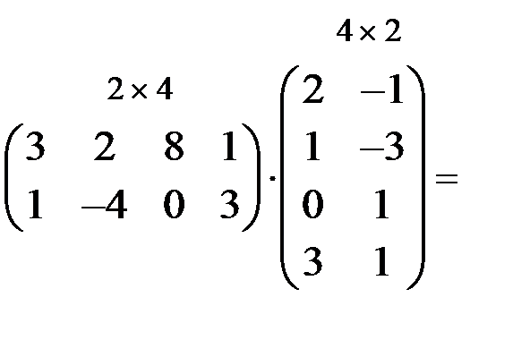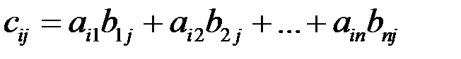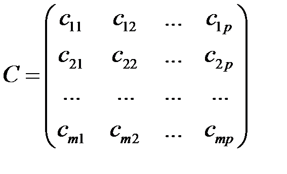 Для двух матриц А и В, у которых число столбцов первой матрицы равно числу строк второй матрицы, определено понятие произведения матрицы А на В следующим образом: С = А · В, где С есть матрица размера m ´ p,