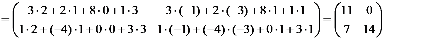 Из определения вытекает следующее правило умножения матриц: чтобы получить элемент, стоящий в i -той строке и j -том столбце произведения двух матриц, нужно элементы i -той строки первой матрицы умножить на соответствующие элементы j –го столбца второй и полученные произведения сложить. Таким образом, чтобы составить первую строку матрицы С нужно перемножить первую строку матрицы А поочередно на все столбцы В; чтобы получить вторую строку произведения С, нужно вторую строку А перемножить последовательно на все столбцы В и т.д. Пример 3