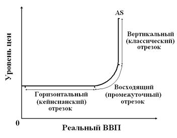 9.2 Совокупное предложение: понятие и закономерности Совокупное предложение (AS) – это общее количество товаров и услуг, которое желают произвести фирмы при различных уровнях цен. В отличие от совокупного спроса интерпретация совокупного предложения не однозначна. Совокупное предложение рассматривается как синтез трех функций (рисунок 9.2).