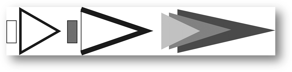 А б в На рисунке А направление задано, но в доминирующем элементе отсутствует развитие формы, преобладание характеристик. На рисунке Б форма развивается по оси направления, но ведомый элемент зрительно останавливает движение. На рисунке В все элементы подчинены развитию формы с чётко заданным направлением.