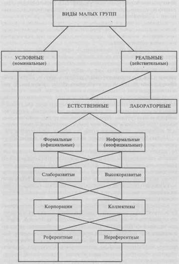 речисленные характеристики представляют собой основные параметры, по которым выделяют, разделяют и изучают малые группы в социальной психологии. Рассмотрим классификацию малых групп (рис. 69). Условные, или номинальные, — это группы, которые объединяют людей, не входящих в состав ни одной малой группы. Иногда выделение таких групп необходимо в исследовательских целях, чтобы сравнить результаты, полученные в реальных группах, с теми, которые характеризуют случайное объединение людей, не имеющих ни постоянных контактов друг с другом, ни общей цели. В противоположность номинальным группам выделяются реальные. Они представляют собой действительно существующие объединения людей, полностью отвечающие определению малой группы. Естественными называют группы, которые складываются сами по себе, независимо от желания экспериментатора. Они возникают и существуют, исходя из потребностей общества или включенных в эти группы людей. В отличие от них лабораторные группы создаются экспериментатором с целью проведения какого-либо научного исследования, проверки выдвинутой гипотезы. Они столь же действенны, как и другие группы, но существуют временно — только в лаборатории. Условные, или номинальные, группы представляют собой искусственно выделяемые исследователем объединения людей. В отличие от них все остальные виды групп реально существуют в обществе и достаточно широко в нем представлены среди людей разных профессий, возрастов, социальной принадлежности. Естественные группы делятся на формальные и неформальные (другое название — официальные и неофициальные). Первых отличает то, что они создаются и существуют лишь в рамках официально признанных организаций, вторые возникают и действуют как бы вне рамок этих организаций (сравните, к примеру, школьный класс как официальную малую группу и неформальное молодежное объединение как неофициальную группу). Цели, преследуемые официальными группами, задаются извне на основе задач, стоящих перед организацией, в которую данная группа включена. Цели неофициальных групп обычно возникают и существуют на базе личных интересов их участников, могут совпадать и расходиться с целями официальных организаций. Малые группы могут быть референтными и нереферентными. Референтная — это любая реальная или условная (номинальная) малая группа, к которой человек добровольно себя причисляет