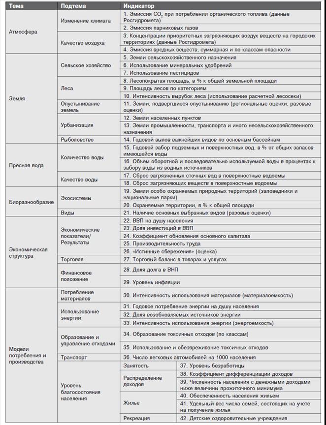 Всемирный банк – лидер по индикаторам устойчивого развития. Ежегодные доклады позволяют оценивать продвижение к целям, поставленным ООН – экономическому росту и борьбе с бедностью. Показатели сгруппированы в 6 разделов: общий; население; окружающая среда; экономика; государство; рынки. Ключевые характеристики общего раздела: - численность населения, - площадь территории и - ВВП (валовой внутренний продукт). На основе «Индикаторов мирового развития» Всемирный Банк с 2000 г. выпускает краткий «зеленый» справочник»(«The Little Green Data Book»). Таблица 5.2 – Показатели из «зеленого» справочника Всемирного Банка